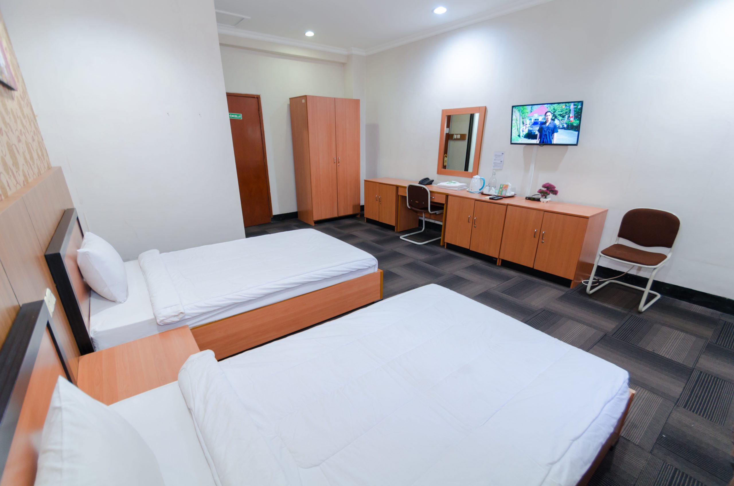 dua tempat tidur ukuran 120 x 200, lantai karpet, wallpaper modern